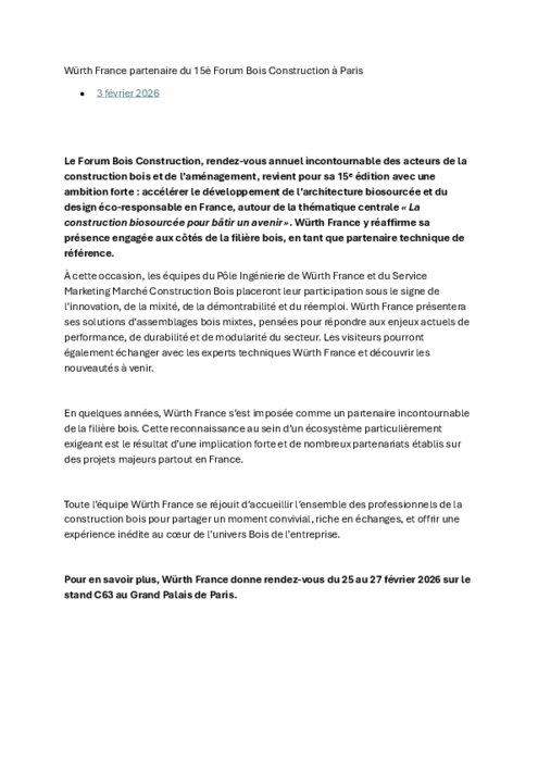 Le Forum Bois Construction, rendez‑vous annuel incontournable des acteurs de la construction bois et de l’aménagement, revient pour sa 15ᵉ édition avec une ambition forte : accélérer le développement de l’architecture biosourcée et du design éco‑responsable en France, autour de la thématique centrale « La construction biosourcée pour bâtir un avenir ». Würth France y réaffirme sa présence engagée aux côtés de la filière bois, en tant que partenaire technique de référence.