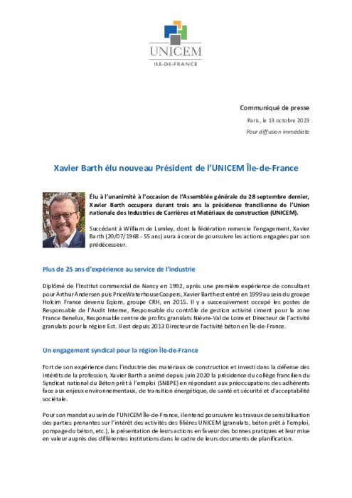 Institutionnels 16 octobre 2023 - 10:51 Élu à l’unanimité à l’occasion de l’Assemblée générale du 28 septembre dernier, Xavier Barth occupera durant trois ans la présidence francilienne de l’Union nationale des Industries de Carrières et Matériaux de construction (UNICEM). PDF (185 Ko) Télécharger