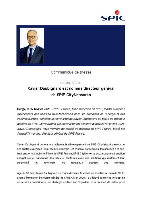 SPIE France, filiale française de SPIE, leader européen indépendant des services multi-techniques dans les domaines de l'énergie et des communications, annonce la nomination de Xavier Daubignard au poste de directeur général de SPIE CityNetworks. Sa nomination est effective depuis le 1er février 2026. Xavier Daubignard reste membre du comité de direction de SPIE France, piloté par Arnaud Tirmarche, directeur général de SPIE France.