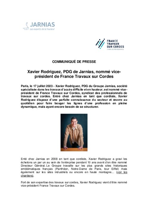Xavier Rodriguez, PDG du Groupe Jarnias, société spécialisée dans les travaux d’accès difficile et en hauteur, est nommé vice-président de France Travaux sur Cordes, syndicat des professionnels de travaux sur cordes. Entré chez Jarnias en tant que cordiste, Xavier Rodriguez dispose d’une parfaite connaissance du secteur et œuvre au quotidien pour faire bouger les lignes d’une profession en pleine dynamique, mais ayant encore besoin de se structurer.