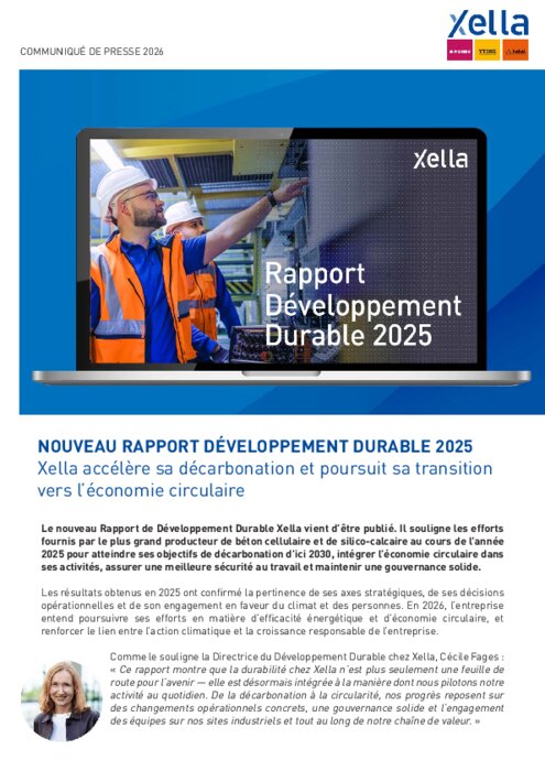 Le nouveau Rapport de Développement Durable Xella vient d’être publié. Il souligne les efforts fournis par le plus grand producteur de béton cellulaire et de silico-calcaire au cours de l’année 2025 pour atteindre ses objectifs de décarbonation d’ici 2030, intégrer l’économie circulaire dans ses activités, assurer une meilleure sécurité au travail et maintenir une gouvernance solide.
