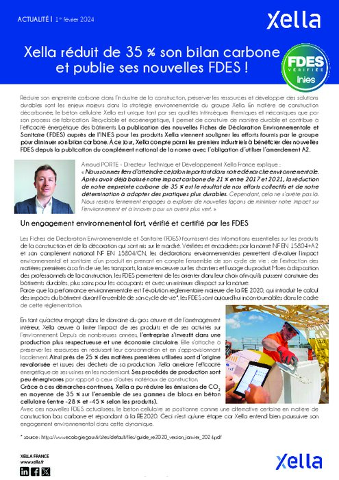 La publication des nouvelles Fiches de Déclaration Environnementale et Sanitaire (FDES) auprès de l’INIES pour les produits Xella viennent souligner les efforts fournis par le groupe pour diminuer son bilan carbone. À ce jour, Xella compte parmi les premiers industriels à bénéficier des nouvelles FDES depuis la publication du complément national de la norme avec l’obligation d’utiliser l’amendement A2.