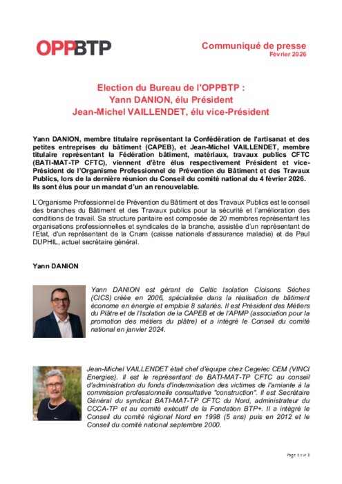 Yann DANION, membre titulaire représentant la Confédération de l'artisanat et des petites entreprises du bâtiment (CAPEB), et Jean-Michel VAILLENDET, membre titulaire représentant la Fédération bâtiment, matériaux, travaux publics CFTC (BATI-MAT-TP CFTC), viennent d’être élus respectivement Président et vice-Président de l’Organisme Professionnel de Prévention du Bâtiment et des Travaux Publics, lors de la dernière réunion du Conseil du comité national du 4 février 2026. Ils sont élus pour un mandat d’un an renouvelable.