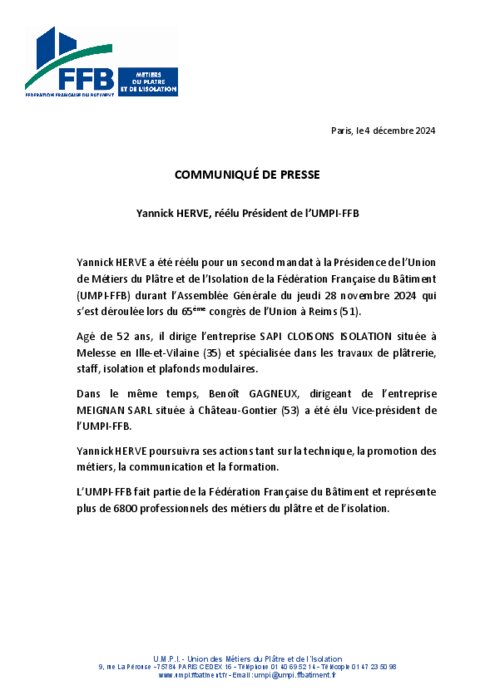 Yannick Hervé, a été réélu pour un second mandat à la Présidence de l’Union de Métiers du Plâtre et de l’Isolation de la Fédération Française du Bâtiment (UMPI-FFB) durant l’Assemblée Générale du jeudi 28 novembre 2024 qui s’est déroulée lors du 65e congrès de l’Union à Reims.