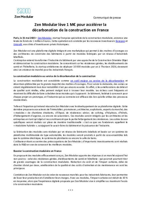 Zen Modular, startup française spécialiste de la construction modulaire, annonce une levée de fonds de 1 million d’euros. Cette opération est conduite par les nouveaux investisseurs Kanopee et Unicraft, aux côtés d’investisseurs privés historiques.