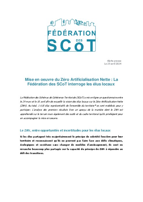 La Fédération des Schémas de Cohérence Territoriale (SCoT) a mis en ligne un questionnaire entre le 29 mars et le 15 avril afin de recueillir la vision des élus locaux sur le Zéro Artificialisation Nette (ZAN). Au total, 1 615 élus représentatifs de l'ensemble du territoire se sont mobilisés pour y participer. L'analyse des premiers résultats livre un aperçu de la manière dont le ZAN est appréhendé sur le terrain mais également des outils et du cadre territorial qu'ils privilégient pour en accompagner la mise en œuvre.
