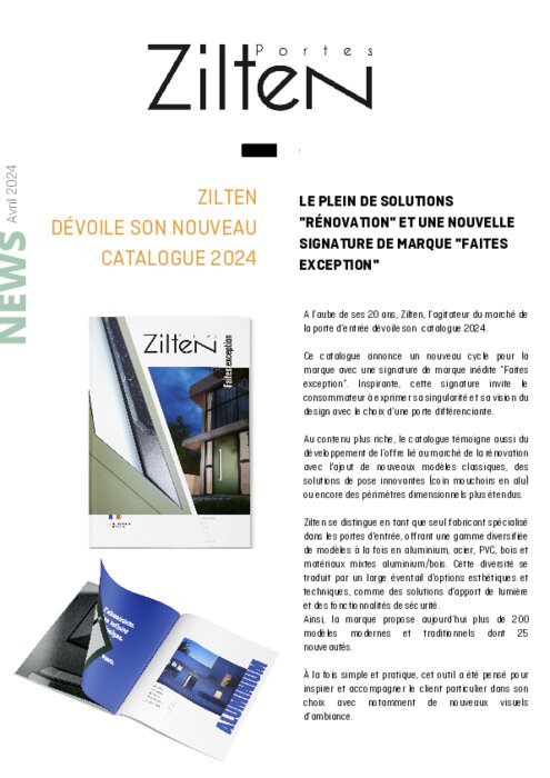 A l’aube de ses 20 ans, Zilten, l’agitateur du marché de la porte d’entrée dévoile son catalogue 2024. Ce catalogue annonce un nouveau cycle pour la marque avec une signature de marque inédite “Faites exception”. Inspirante, cette signature invite le consommateur à exprimer sa singularité et sa vision du design avec le choix d’une porte différenciante.
