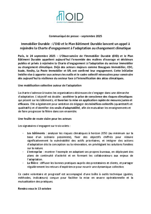 L’Observatoire de l’Immobilier Durable (OID) et le Plan Bâtiment Durable appellent l’ensemble des maîtres d’ouvrage et décideurs publics et privés à rejoindre la Charte d’engagement à l’adaptation du secteur immobilier au changement climatique. Déjà, des acteurs majeurs comme Bouygues Immobilier, CDC, Icade, Nexity, La Poste Immobilier et SFL ont confirmé leur engagement. Cette initiative inédite vise à apporter aux acteurs les outils et le cadre collectif nécessaires pour construire dès aujourd’hui la résilience du secteur face à l’intensification des aléas climatiques.