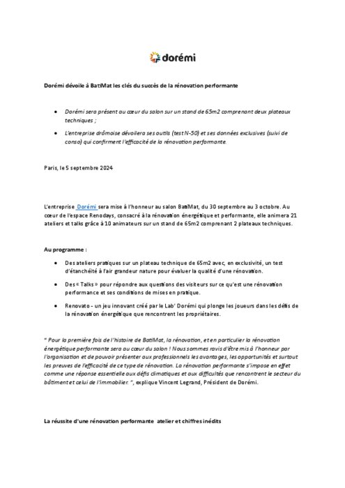 L’entreprise Dorémi sera mise à l’honneur au salon BatiMat, du 30 septembre au 3 octobre. Au cœur de l’espace Renodays, consacré à la rénovation énergétique et performante, elle animera 21 ateliers et talks grâce à 10 animateurs sur un stand de 65m2 comprenant 2 plateaux techniques.