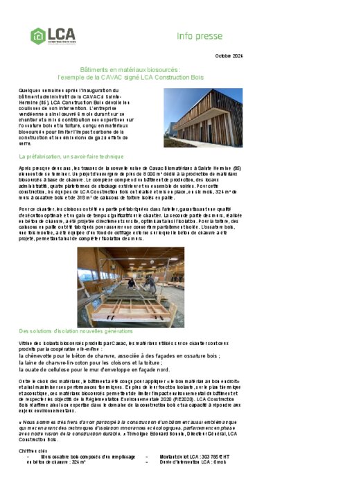 Quelques semaines après l’inauguration du bâtiment administratif de la CAVAC à SainteHermine (85), LCA Construction Bois dévoile les coulisses de son intervention. L’entreprise vendéenne a ainsi œuvré 6 mois durant sur ce
