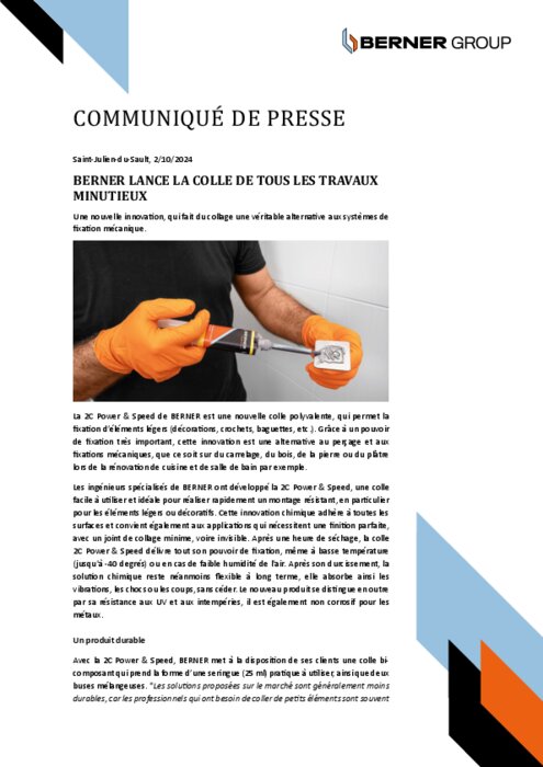 La 2C Power & Speed de BERNER est une nouvelle colle polyvalente, qui permet la fixation d’éléments légers (décorations, crochets, baguettes, etc.). Grâce à un pouvoir de fixation très important, cette innovation est une alternative au perçage et aux fixations mécaniques, que ce soit sur du carrelage, du bois, de la pierre ou du plâtre lors de la rénovation de cuisine et de salle de bain par exemple.