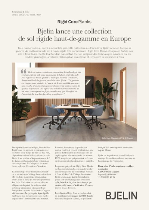 Pour donner suite au succès rencontrée par cette collection aux Etats-Unis, Bjelin lance en Europe sa gamme de revêtements de sol à noyau rigide très performante : Rigid Core Planks. Conçus en Suède, ces sols offrent l’aspect et le toucher d’un bois raffiné tout en intégrant des technologies avancées qui les rendent plus légers, améliorent l’absorption acoustique et renforcent la résistance à l’eau.
