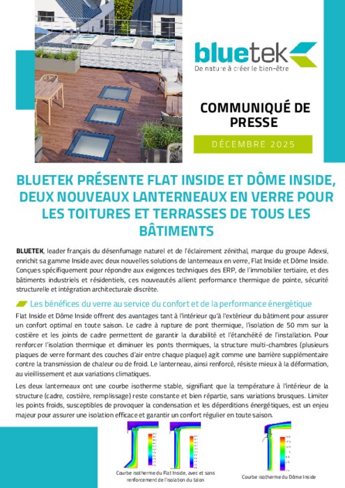 BLUETEK, leader français du désenfumage naturel et de l’éclairement zénithal, marque du groupe Adexsi, enrichit sa gamme Inside avec deux nouvelles solutions de lanterneaux en verre, Flat Inside et Dôme Inside. Conçues spécifiquement pour répondre aux exigences techniques des ERP, de l’immobilier tertiaire et des bâtiments industriels et résidentiels, ces nouveautés allient performance thermique de pointe, sécurité structurelle et intégration architecturale discrète.