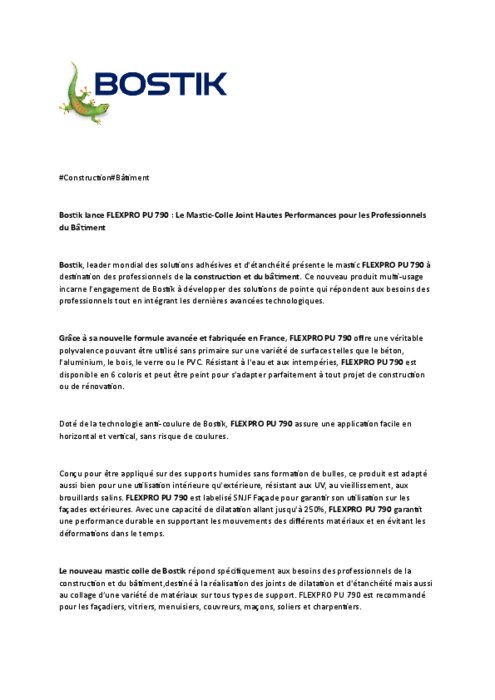 Bostik, leader mondial des solutions adhésives et d'étanchéité présente le mastic FLEXPRO PU 790 à destination des professionnels de la construction et du bâtiment. Ce nouveau produit multi-usage incarne l'engagement de Bostik à développer des solutions de pointe qui répondent aux besoins des professionnels tout en intégrant les dernières avancées technologiques.