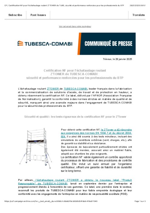 L’échafaudage roulant Z'Tower de Tubesca-Comabi, leader français dans la fabrication et la commercialisation de solutions d'accès, de travail et de protection en hauteur, a obtenu récemment la certification NF. Ce label, délivré par l'AFNOR (Association Française de Normalisation), garantit la conformité à des normes strictes en matière de qualité et de sécurité, marquant ainsi une avancée majeure dans l’engagement de Tubesca-Comabi pour la sécurité des professionnels du BTP.