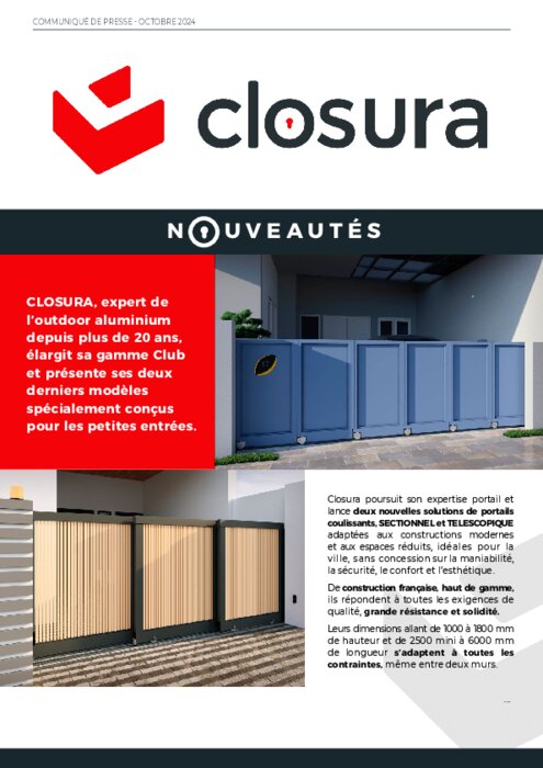 Closura poursuit son expertise portail et lance deux nouvelles solutions de portails coulissants, SECTIONNEL et TELESCOPIQUE adaptées aux constructions modernes et aux espaces réduits, idéales pour la ville, sans concession sur la maniabilité, la sécurité, le confort et l’esthétique. De construction française, haut de gamme, ils répondent à toutes les exigences de qualité, grande résistance et solidité.