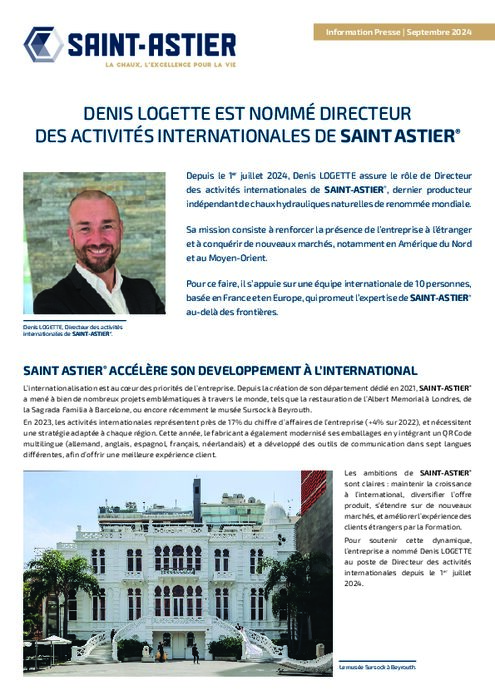 Depuis le 1er juillet 2024, Denis LOGETTE assure le rôle de Directeur des activités internationales de SAINT-ASTIER, dernier producteur indépendant de chaux hydrauliques naturelles de renommée mondiale. Sa mission consiste à renforcer la présence de l’entreprise à l’étranger et à conquérir de nouveaux marchés, notamment en Amérique du Nord