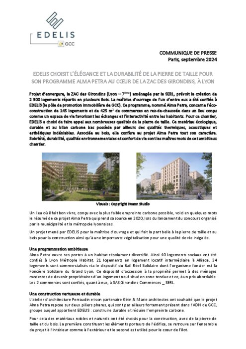 Projet d’envergure, la ZAC des Girondins (Lyon – 7ème) aménagée par la SERL, prévoit la création de 2 900 logements répartis en plusieurs ilots. La maîtrise d’ouvrage de l’un d’entre eux a été confiée à EDELIS (le pôle de promotion immobilière de GCC). Ce programme, nommé Alma Petra, concerne l’éco-construction de 145 logements et de 425 m2 de commerces en rez-de-chaussée dans un lieu conçu comme un espace de vie favorisant les échanges et l’interactivité entre les habitants. Pour ce chantier, EDELIS a choisi de faire appel aux nombreuses qualités de la pierre de taille.