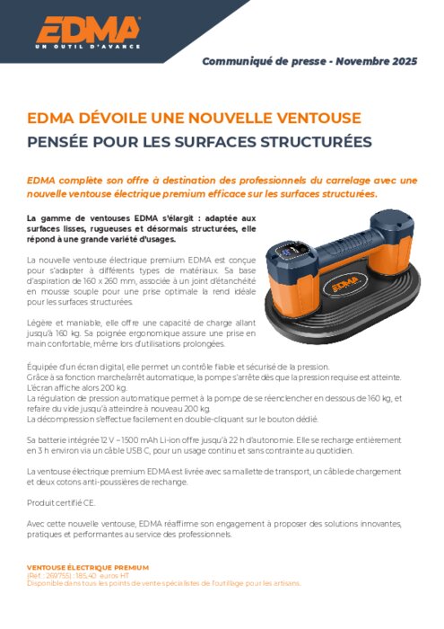 Industriels 12 novembre 2025 - 10:47 La gamme de ventouses EDMA s'élargit : adaptée aux surfaces lisses, rugueuses et désormais structurées, elle répond à une grande variété d'usages. PDF (411 Ko) Télécharger credit Edma