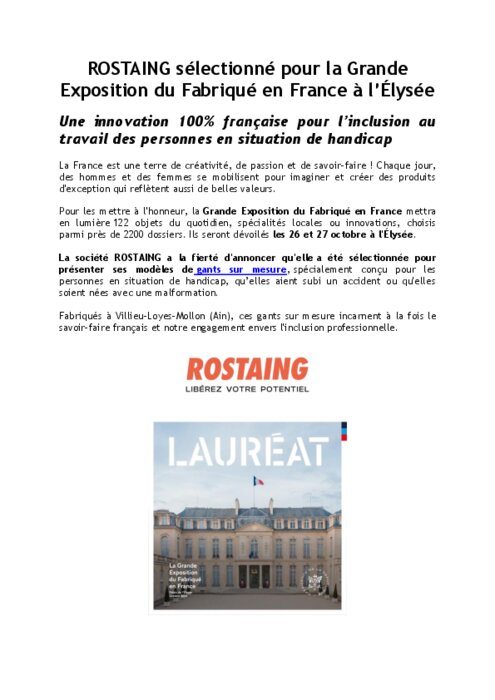 La société Rostaing a la fierté d'annoncer qu'elle a été sélectionnée pour présenter ses modèles de gants sur mesure, spécialement conçus pour les personnes en situation de handicap, qu’elles aient subi un accident ou qu'elles soient nées avec une malformation. Fabriqués à Villieu-Loyes-Mollon (Ain), ces gants sur mesure incarnent à la fois le savoir-faire français et notre engagement envers l'inclusion professionnelle.