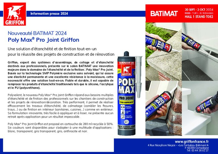 Griffon, expert des systèmes d’assemblage, de collage et d’étanchéité destinés aux professionnels, présente sur le salon BATIMAT une innovation majeure dans le domaine de l’étanchéité et de la finition : Poly Max Pro Joint. Basée sur la technologie SMP Polymère exclusive sans solvant, qui lui assure une élasticité permanente et une excellente résistance à la moisissure, cette nouveauté offre une solution tout-en-un. Fiable et durable, il est capable de remplacer les produits d’étanchéité traditionnels tels que le silicone, l’acrylique et le PU (polyuréthane).
