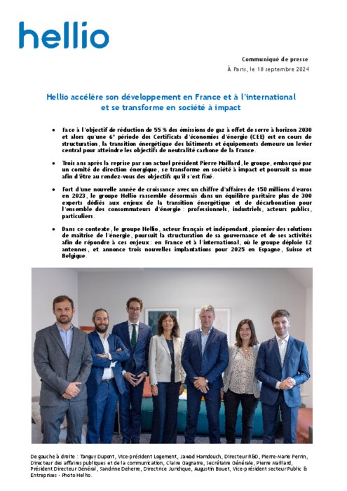 Fort d’une nouvelle année de croissance avec un chiffre d’affaires de 150 millions d’euros en 2023, le groupe Hellio rassemble désormais dans un équilibre paritaire plus de 300 experts dédiés aux enjeux de la transition énergétique et de décarbonation pour l’ensemble des consommateurs d’énergie : professionnels, industriels, acteurs publics, particuliers. Dans ce contexte, le groupe Hellio, acteur français et indépendant, pionnier des solutions de maîtrise de l’énergie, poursuit la structuration de sa gouvernance et de ses activités afin de répondre à ces enjeux : en France et à l’international, où le groupe déploie 12 antennes, et annonce trois nouvelles implantations pour 2025 en Espagne, Suisse et Belgique.