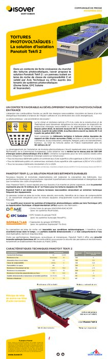 Dans un contexte de forte croissance du marché des toitures photovoltaïques, Isover propose la solution Panotoit Tekfi 2 : un panneau isolant en laine de roche de classe de compressibilité C et validé par Avis Technique ou ATEx auprès des