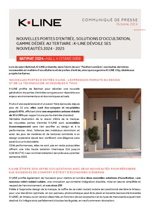 Industriels 03 octobre 2024 - 14:29 Lors du salon Batimat, K•LINE a présenté, dans l’écrin de son “Pavillon Lumière”, ses toutes dernières nouveautés en matière d’occultations et de portes d’entrée, ainsi que sa gamme K•LINE City, dédiée aux projets tertiaires. PDF (438 Ko) Télécharger