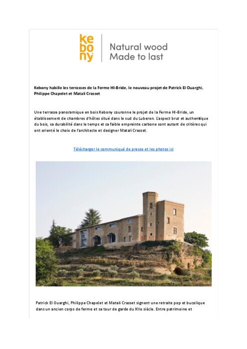 Une terrasse panoramique en bois Kebony couronne le projet de la Ferme HI-Bride, un établissement de chambres d’hôtes situé dans le sud du Luberon. L’aspect brut et authentique du bois, sa durabilité dans le temps et sa faible empreinte carbone sont autant de critères qui ont orienté le choix de l’architecte et designer Matali Crasset.