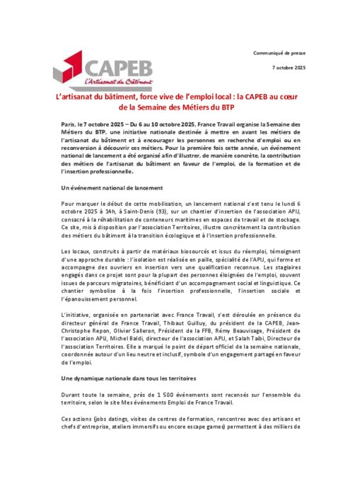 Du 6 au 10 octobre, France Travail organise la Semaine des Métiers du BTP, une initiative nationale destinée à mettre en avant les métiers de l’artisanat du bâtiment et à encourager les personnes en recherche d’emploi ou en reconversion à découvrir ces métiers. Pour la première fois cette année, un événement national de lancement a été organisé afin d’illustrer, de manière concrète, la contribution des métiers de l’artisanat du bâtiment en faveur de l’emploi, de la formation et de l’insertion professionnelle.