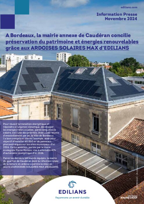 Pour réussir la transition énergétique et répondre à l’urgence climatique, développer les énergies renouvelables, parmi lesquelles le solaire, est l’une des priorités. Avec 2 100 heures d’ensoleillement par an, la ville de Bordeaux l’a bien compris et donne l’exemple, avec pour objectif d’installer 60 000 m2 de panneaux photovoltaïques sur les sites municipaux d’ici 2026. Cette ambition, portée par le maire écologiste Pierre Hurmic, vise à atteindre 41% d’autonomie énergétique d’ici 2026. Parmi les derniers bâtiments équipés, la mairie du quartier de Caudéran, dont la réfection totale de la toiture en ardoise a permis la mise en œuvre d’ardoises solaires Max d'Edilians.