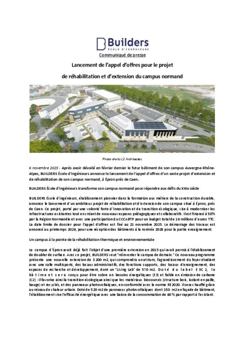 Après avoir dévoilé en février dernier le futur bâtiment de son campus Auvergne-Rhône-Alpes, BUILDERS École d’Ingénieurs annonce le lancement de l’appel d’offres d’un vaste projet d’extension et de réhabilitation de son campus normand, à Épron près de Caen. BUILDERS École d’ingénieurs transforme son campus normand pour répondre aux défis du XXIe siècle.
