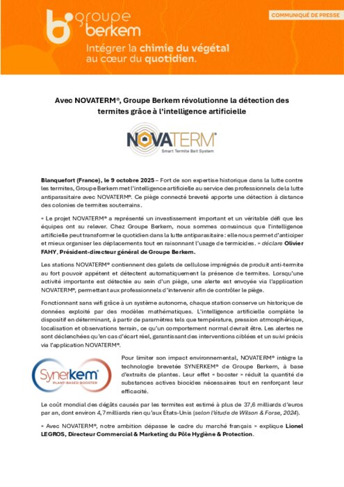 Fort de son expertise historique dans la lutte contre les termites, Groupe Berkem met l’intelligence artificielle au service des professionnels de la lutte antiparasitaire avec NOVATERM®. Ce piège connecté breveté apporte une détection à distance des colonies de termites souterrains.