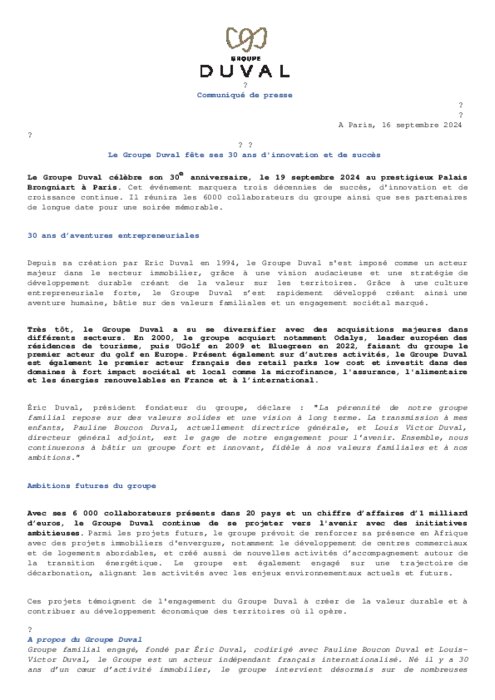 Le Groupe Duval célèbre son 30e anniversaire, le 19 septembre 2024 au prestigieux Palais Brongniart à Paris. Cet événement marquera trois décennies de succès, d'innovation et de croissance continue. Il réunira les 6000 collaborateurs du groupe ainsi que ses partenaires de longue date pour une soirée mémorable.