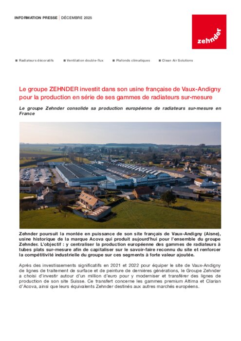 Zehnder poursuit la montée en puissance de son site français de Vaux-Andigny (Aisne), usine historique de la marque Acova qui produit aujourd’hui pour l’ensemble du groupe Zehnder. L’objectif : y centraliser la production européenne des gammes de radiateurs à tubes plats sur-mesure afin de capitaliser sur le savoir-faire reconnu du site et renforcer la compétitivité industrielle du groupe sur ces segments à forte valeur ajoutée.