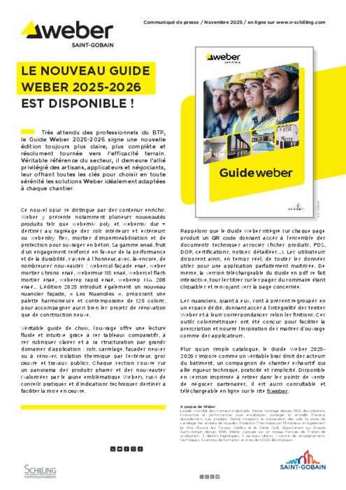 Très attendu des professionnels du BTP, le Guide Weber 2025-2026 signe une nouvelle édition toujours plus claire, plus complète et résolument tournée vers l’efficacité terrain. Véritable référence du secteur, il demeure l’allié privilégié des artisans, applicateurs et négociants, leur offrant toutes les clés pour choisir en toute sérénité les solutions Weber idéalement adaptées à chaque chantier.