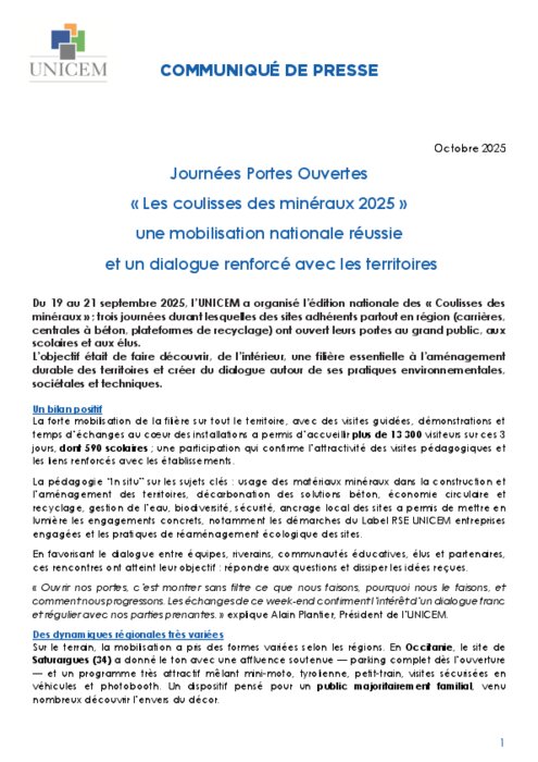 Du 19 au 21 septembre 2025, l’UNICEM a organisé l’édition nationale des « Coulisses des minéraux » ; trois journées durant lesquelles des sites adhérents partout en région (carrières, centrales à béton, plateformes de recyclage) ont ouvert leurs portes au grand public, aux scolaires et aux élus. L’objectif était de faire découvrir, de l’intérieur, une filière essentielle à l’aménagement durable des territoires et créer du dialogue autour de ses pratiques environnementales, sociétales et techniques.
