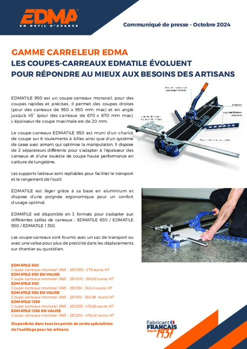 EDMATILE 950 est un coupe-carreaux monorail, pour des coupes rapides et précises. Il permet des coupes droites