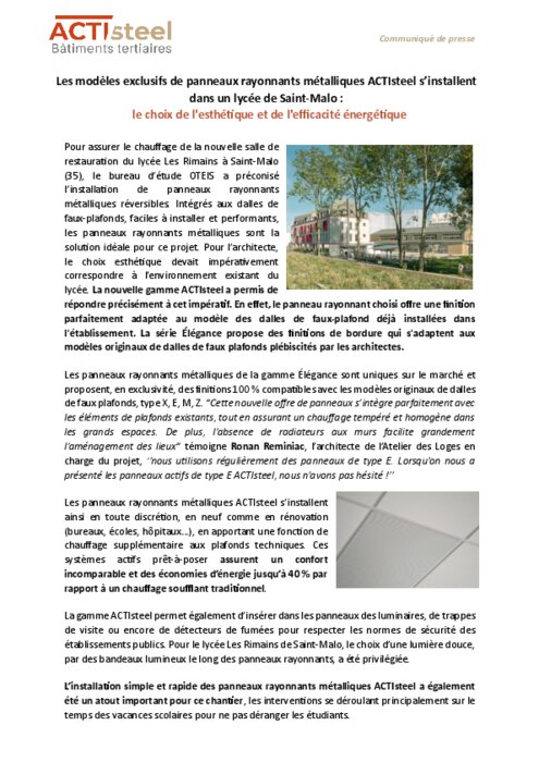 faux-plafonds, faciles à installer et performants, les panneaux rayonnants métalliques sont la solution idéale pour ce projet. Pour l’architecte, le choix esthétique devait impérativement correspondre à l’environnement existant du lycée. La nouvelle gamme ACTIsteel a permis de répondre précisément à cet impératif.