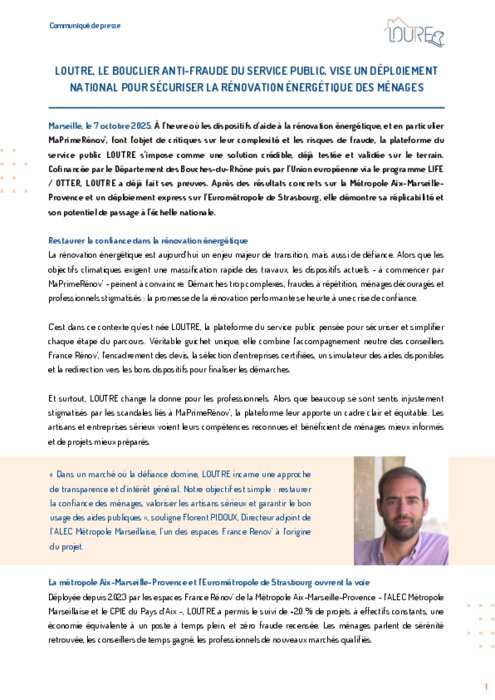 À l’heure où les dispositifs d’aide à la rénovation énergétique, et en particulier MaPrimeRénov’ , font l’objet de critiques sur leur complexité et les risques de fraude, la plateforme du service public Loutre s’impose comme une solution crédible, déjà testée et validée sur le terrain. Cofinancée par le Département des Bouches-du-Rhône puis par l’Union européenne via le programme Life/OTTER, LOUTRE a déjà fait ses preuves. Après des résultats concrets sur la Métropole Aix-Marseille-Provence et un déploiement express sur l’Eurométropole de Strasbourg, elle démontre sa réplicabilité et son potentiel de passage à l’échelle nationale.