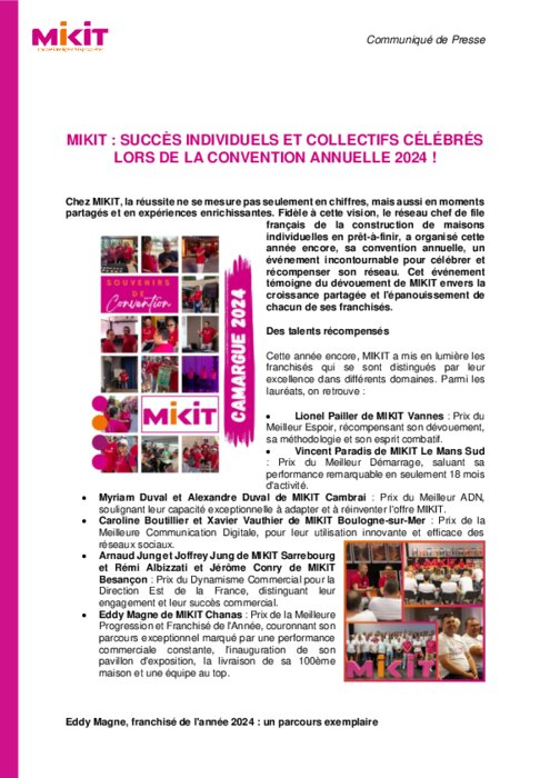 Chez Mikit, la réussite ne se mesure pas seulement en chiffres, mais aussi en moments partagés et en expériences enrichissantes. Fidèle à cette vision, le réseau chef de file français de la construction de maisons individuelles en prêt-à-finir a organisé cette année encore sa convention annuelle, un événement incontournable pour célébrer et récompenser son réseau.