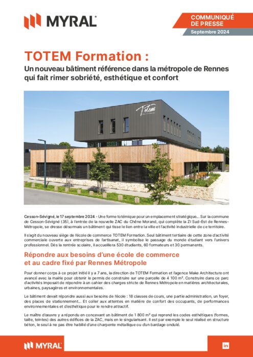 Une forme totémique pour un emplacement stratégique… Sur la commune de Cesson-Sévigné (35), à l’entrée de la nouvelle ZAC du Chêne Morand, qui complète la ZI Sud-Est de RennesMétropole, se dresse désormais un bâtiment qui tisse le lien entre la ville et l’activité industrielle de ce territoire. Il s’agit du nouveau siège de l’école de commerce TOTEM Formation. Seul bâtiment tertiaire de cette zone d’activité commerciale ouverte aux entreprises de l’artisanat, il symbolise le passage du monde étudiant vers l’univers professionnel. Dès la rentrée scolaire, il accueillera 530 étudiants, 60 formateurs et 30 permanents.