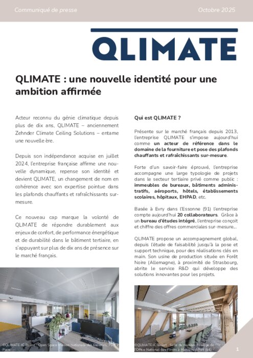 Acteur reconnu du génie climatique depuis plus de dix ans, QLIMATE – anciennement Zehnder Climate Ceiling Solutions – entame une nouvelle ère. Depuis son indépendance acquise en juillet 2024, l’entreprise française affirme aujourd'hui une nouvelle dynamique, repense son identité et devient QLIMATE, un changement de nom en cohérence avec son expertise pointue dans les plafonds chauffants et rafraîchissants sur-mesure.
