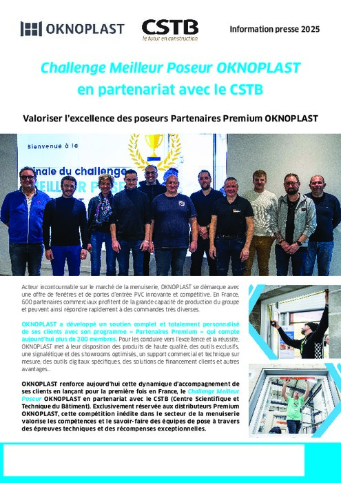 Oknoplast lance pour la première fois en France le Challenge Meilleur Poseur en partenariat avec le CSTB (Centre scientifique et technique du bâtiment). Exclusivement réservée aux distributeurs Premium Oknoplast, cette compétition inédite dans le secteur de la menuiserie valorise les compétences et le savoir-faire des équipes de pose à travers des épreuves techniques et des récompenses exceptionnelles.