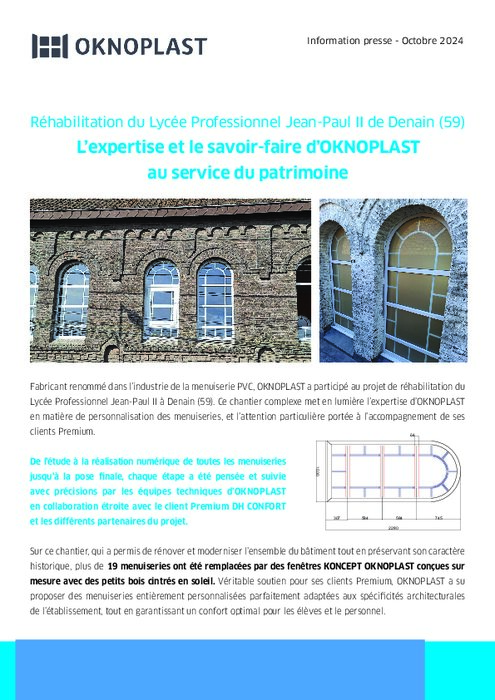 Fabricant renommé dans l'industrie de la menuiserie PVC, OKNOPLAST a participé au projet de réhabilitation du Lycée Professionnel Jean-Paul II à Denain (59). Ce chantier complexe met en lumière l'expertise d'OKNOPLAST en matière de personnalisation des menuiseries, et l'attention particulière portée à l'accompagnement de ses clients Premium.