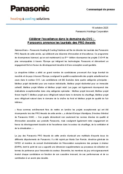 Panasonic Heating and Cooling Solutions est fier de dévoiler les lauréats des Panasonic PRO Awards de cette année, qui célèbrent une décennie d'innovation et d'excellence. Ce programme de récompenses biannuel, qui en est maintenant à sa 5e édition, récompense les projets CVC+R les plus remarquables à travers l'Europe qui intègrent les technologies Panasonic et démontrent un engagement fort en faveur du développement durable et d'une conception avant-gardiste.