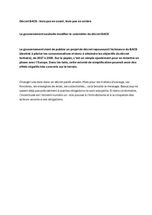 Le gouvernement vient de publier un projet de décret repoussant l’échéance du BACS (destiné à piloter les consommations et donc à atteindre les objectifs du décret tertiaire), de 2027 à 2030. Sur le papier, c’est un simple ajustement pour se remettre en phase avec l’Europe. Dans les faits, cette volonté de simplification pourrait avoir des effets négatifs très concrets sur le terrain.