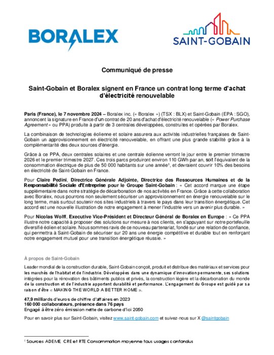 Industriels 07 novembre 2024 - 10:56 Boralex et Saint-Gobain, annoncent la signature en France d’un contrat de 20 ans d'achat d'électricité renouvelable (« Power Purchase Agreement » ou PPA) produite à partir de trois centrales développées, construites et opérées par Boralex. PDF (157 Ko) Télécharger
