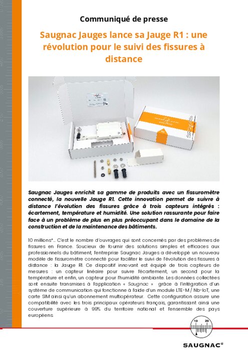 Saugnac Jauges enrichit sa gamme de produits avec un fissuromètre connecté, la nouvelle Jauge R1. Cette innovation permet de suivre à distance l’évolution des fissures grâce à trois capteurs intégrés : écartement, température et humidité. Une solution rassurante pour faire face à un problème de plus en plus préoccupant dans le domaine de la