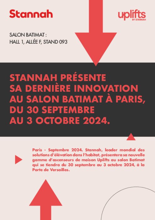 Industriels 17 septembre 2024 - 11:32 Stannah, leader mondial des solutions d’élévation dans l’habitat, présentera sa nouvelle gamme d’ascenseurs de maison Uplifts au salon Batimat qui se tiendra du 30 septembre au 3 octobre 2024, à la Porte de Versailles. PDF (158 Ko) Télécharger